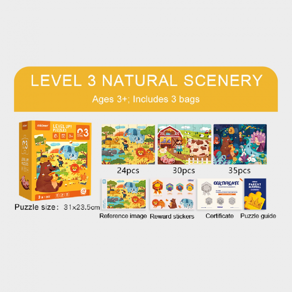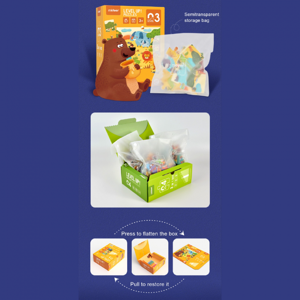 Advanced Puzzle series are fun and educational puzzles with artistic beauty, which will help develop children’s brain potential step by step. Divided into seven levels, this series match children’s mental development, with the aim to enhance their logical thinking, hand-eye coordination, multidimensional cognition as well as develop their concentration. From 2 to 247 pieces, simple to complex, the illustrations on this series, drawn by a French artist and illustrator - Maud Lienard, give children a high-quality aesthetic experience.
