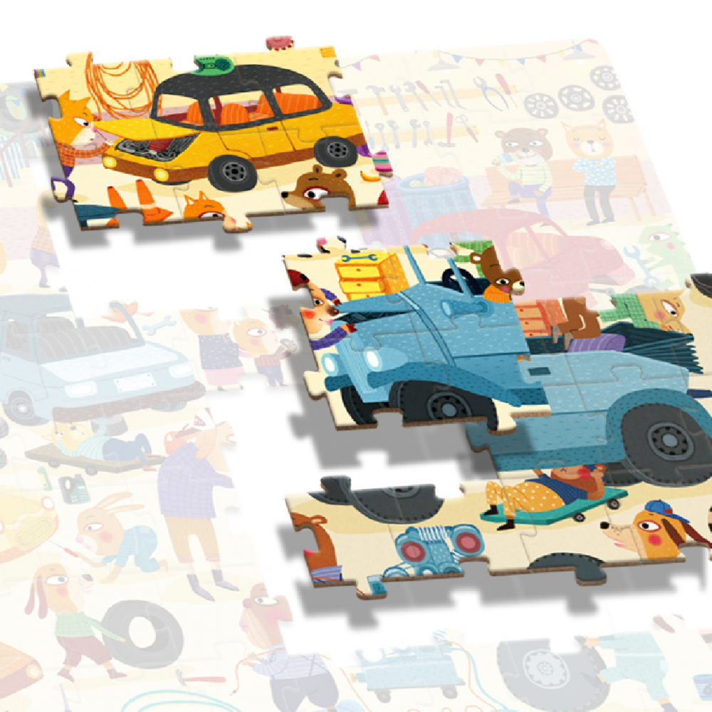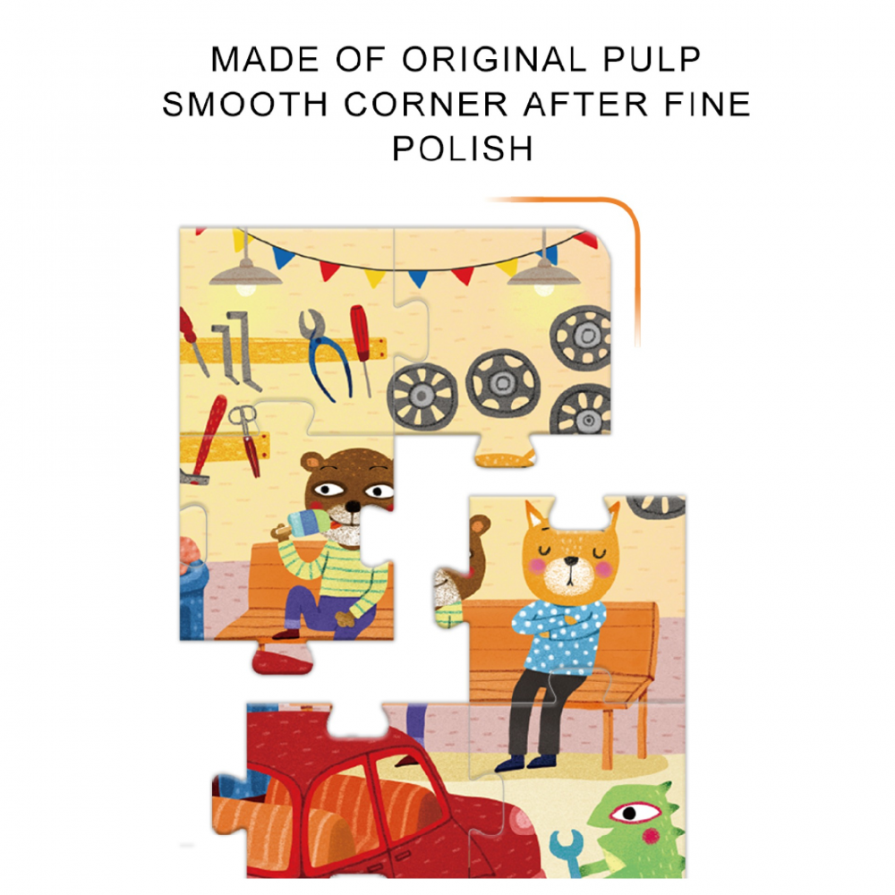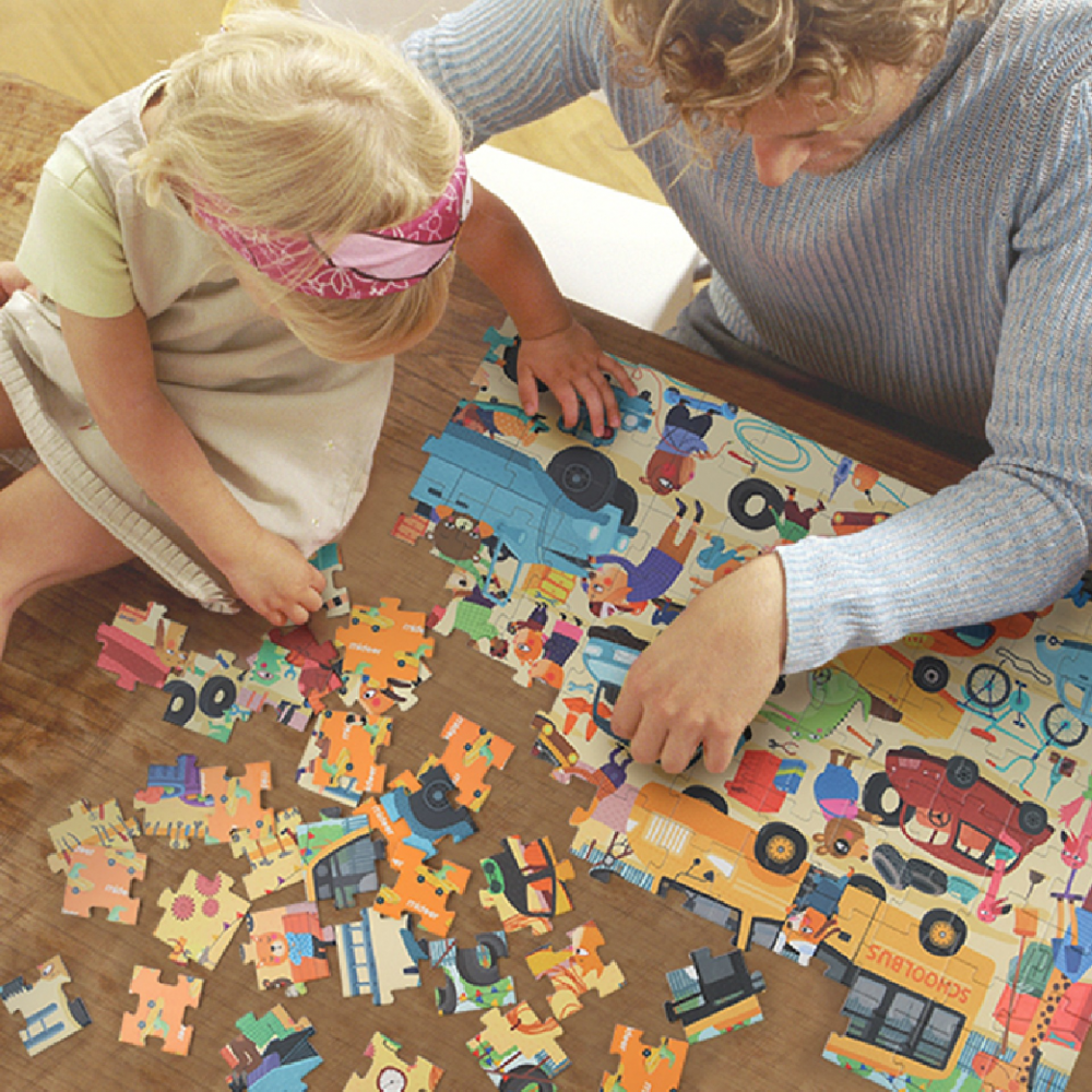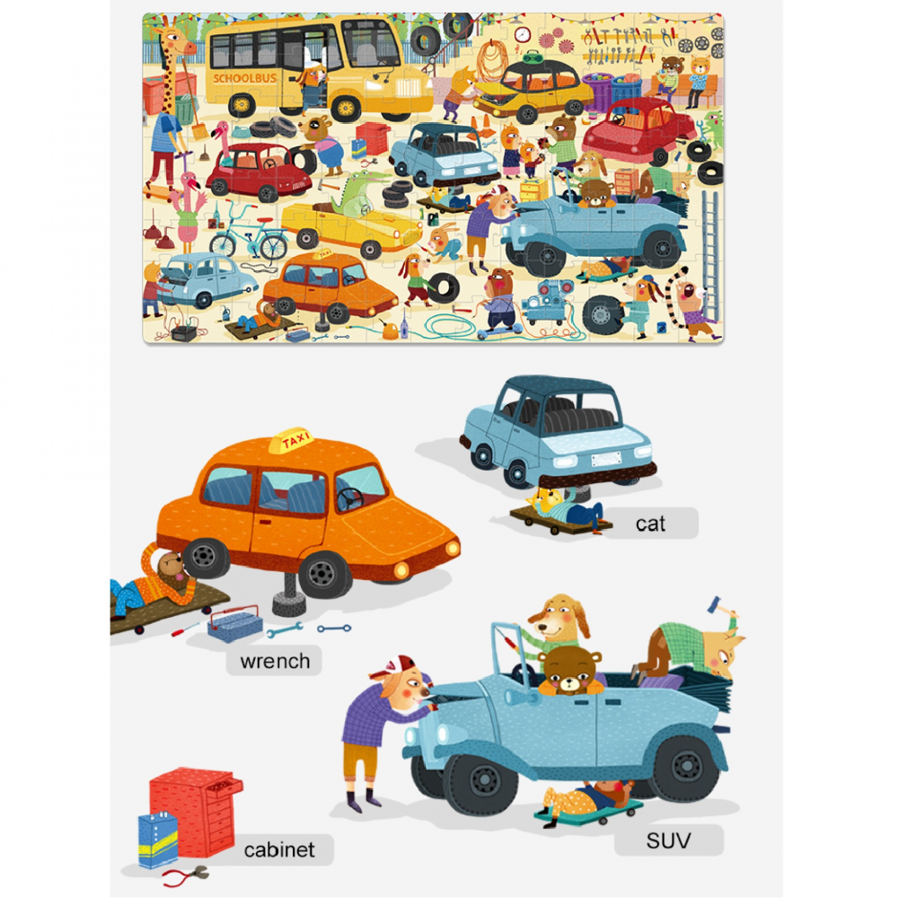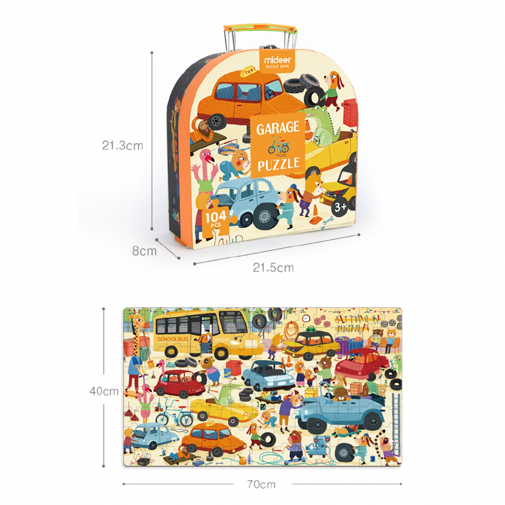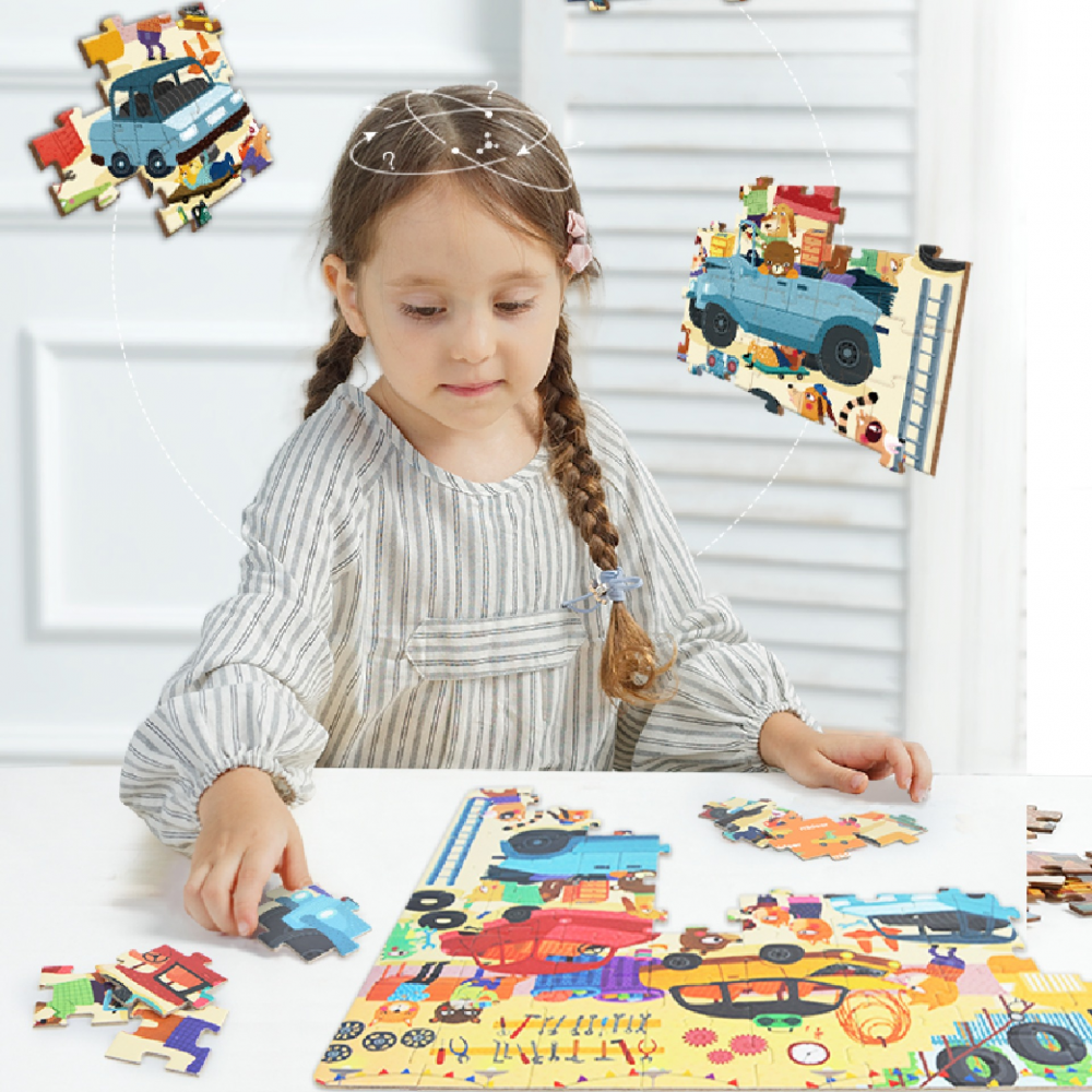 104 pcs puzzle in the gift package, adorable design. With original designed illustration specialized for children. An easy way to learn with fun about all things that go when finished.