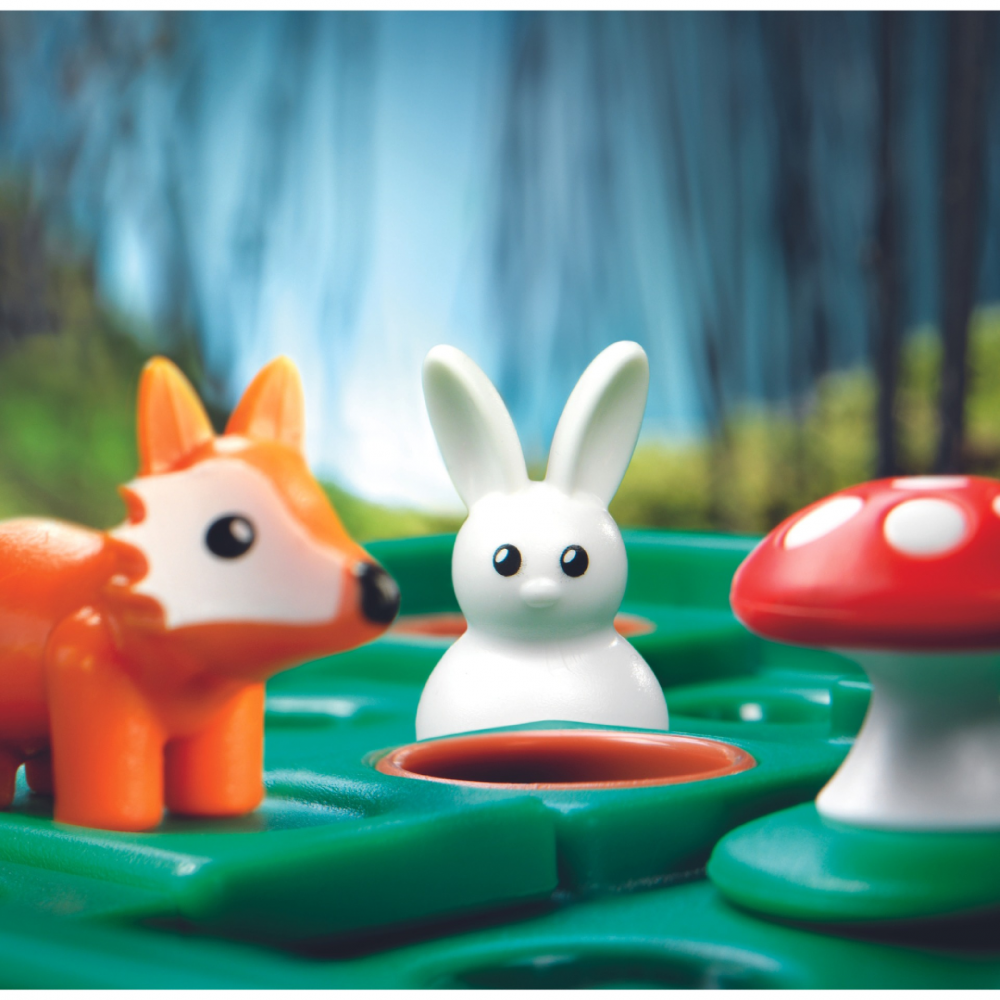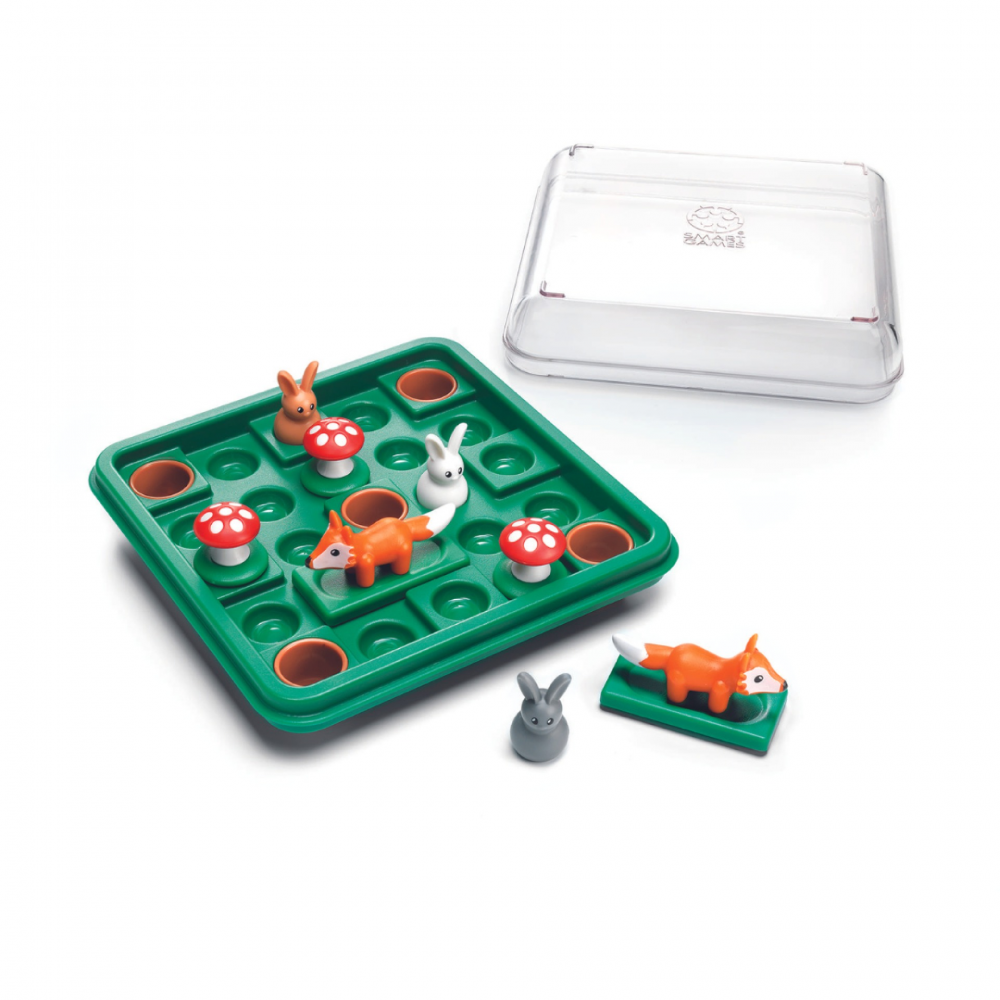 - game in handy storage box, ideal for traveling, 3 rabbits, 3 mushrooms, 2 foxes, booklet with 60 tasks & solutions