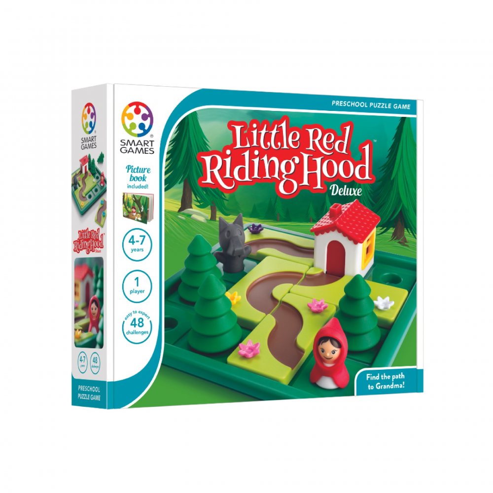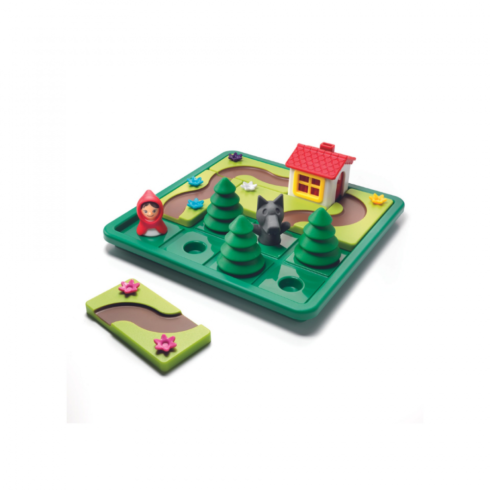 - Game board, 5 puzzle pieces with roads, Little Red Riding Hood & Bad Wolf, 3 trees and 1 house. Booklet with 48 challenges (24 without the wolf, 24 with the wolf). Bonus picture book with images