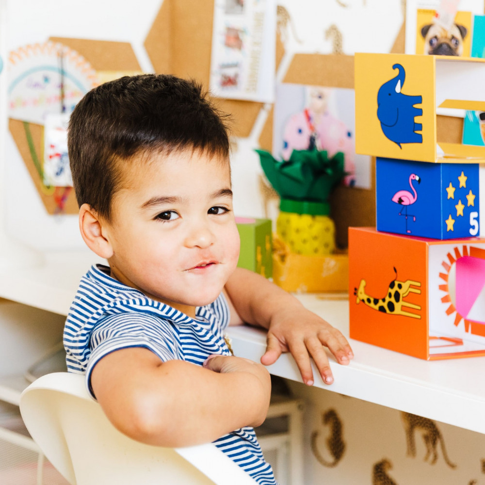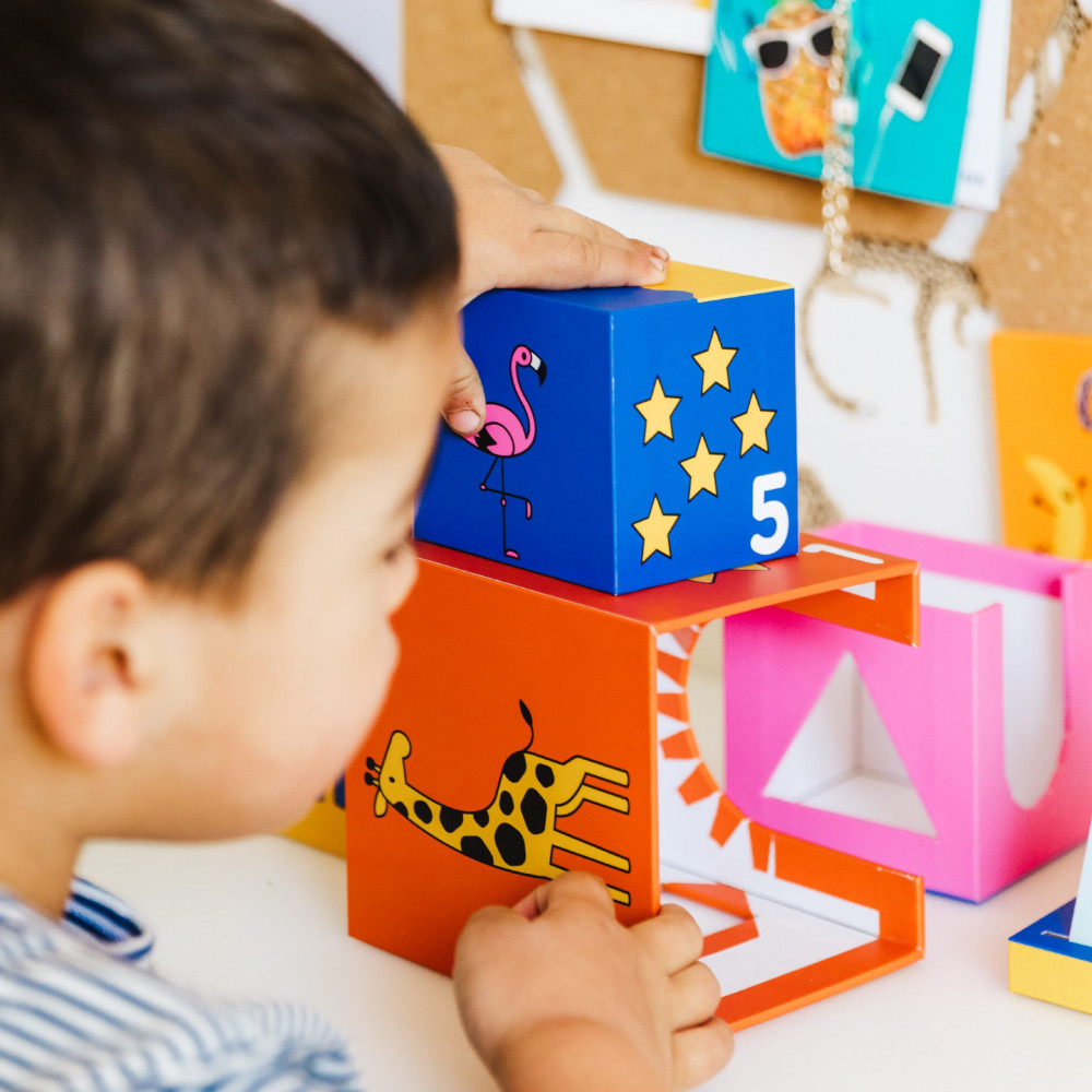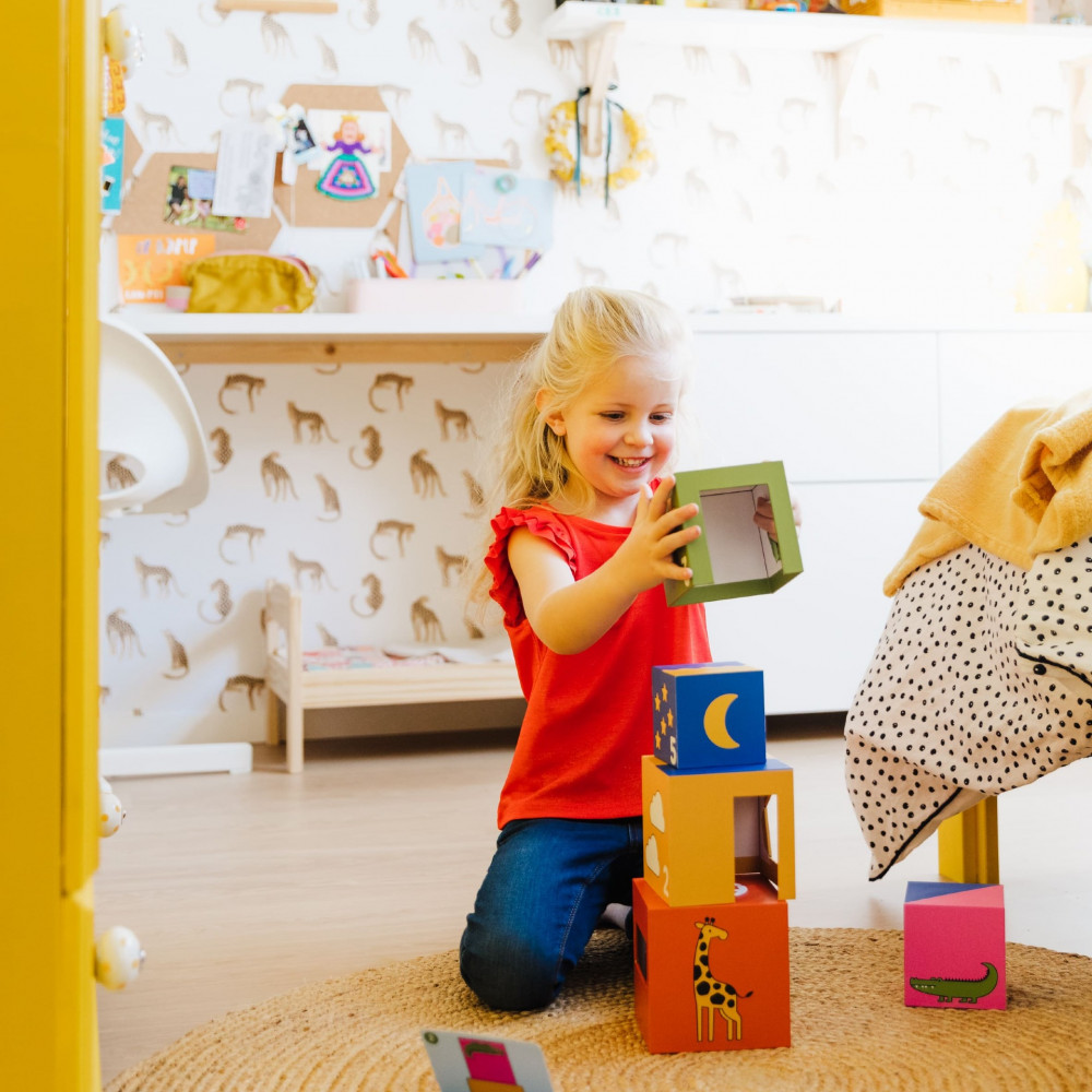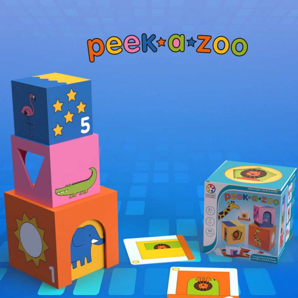 The zoo-animals love playing peekaboo! Can you spy with your little eye where these fun-loving animals need to go? Choose a challenge and try to stack the right cubes as shown on the challenge card.