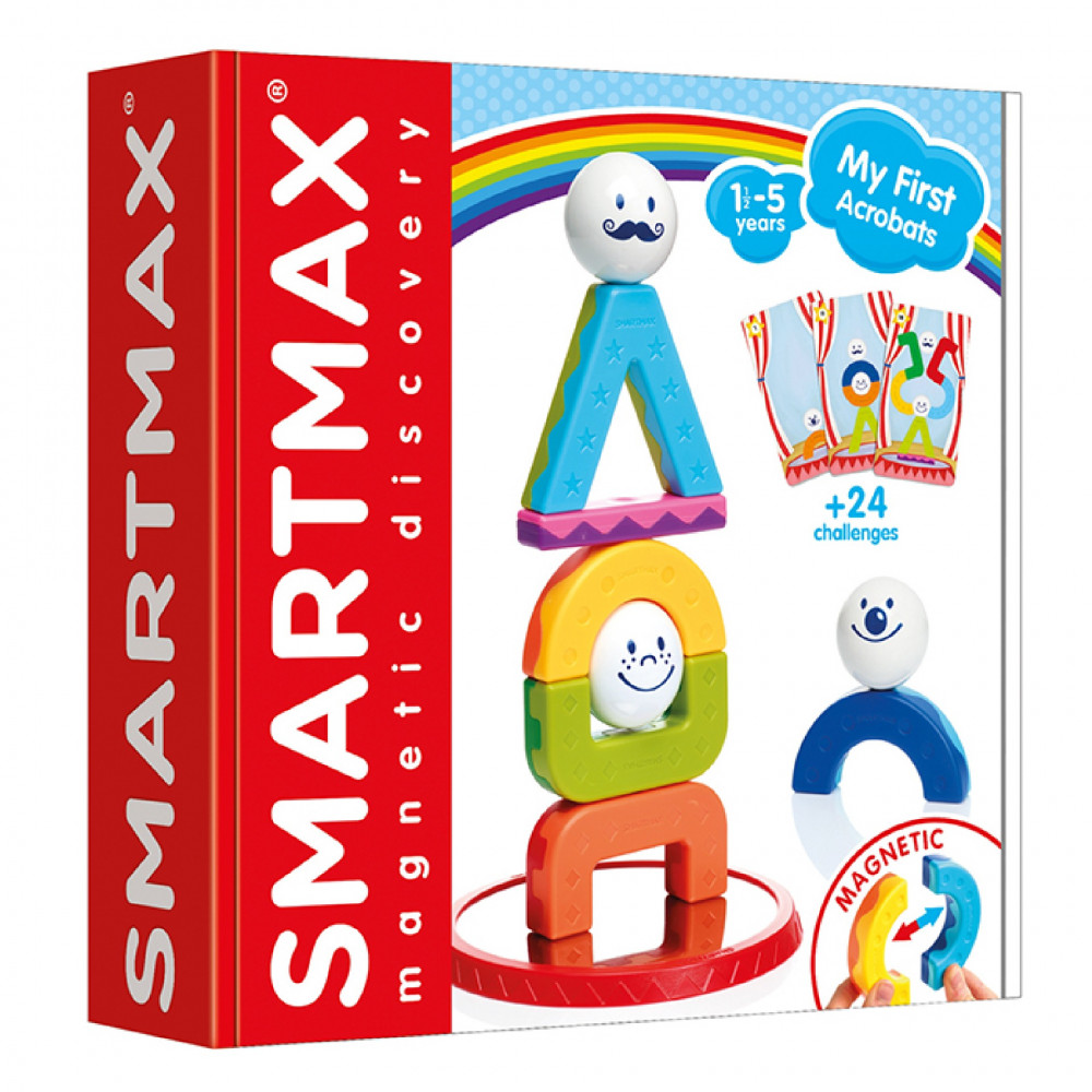 Create your own acrobatic structures, or try to build the structure on one of the 24 challenge cards which are included. The red base has a metal surface, which gives the needed stability when building the craziest acrobatic structures. In 6 of these challenges only a black silhouette of the structure is given. Can you find the correct shapes to complete the challenge?