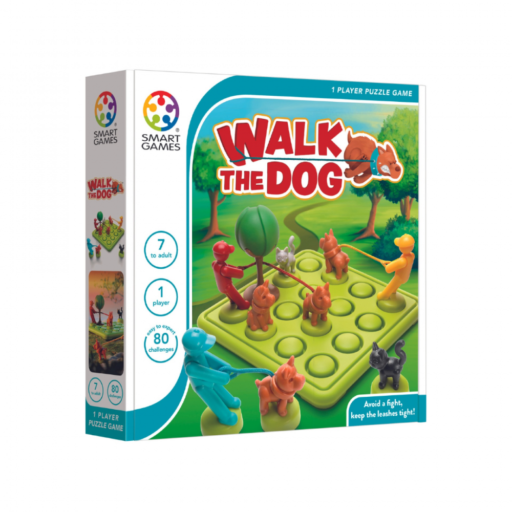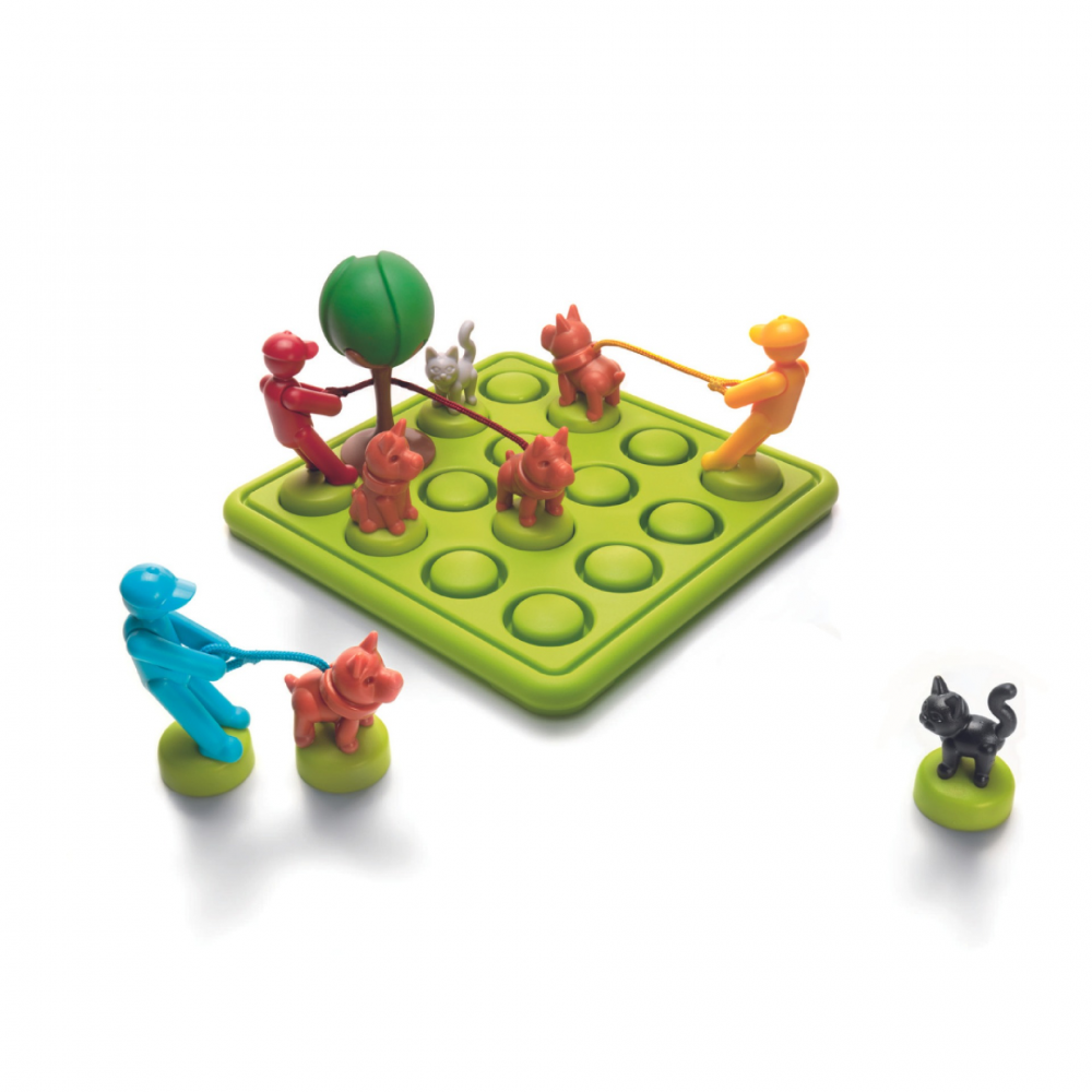 - Game board, 3 people with dogs on a leash, 1 sitting dog, 2 cats, 1 tree, booklet with challenges and solutions.